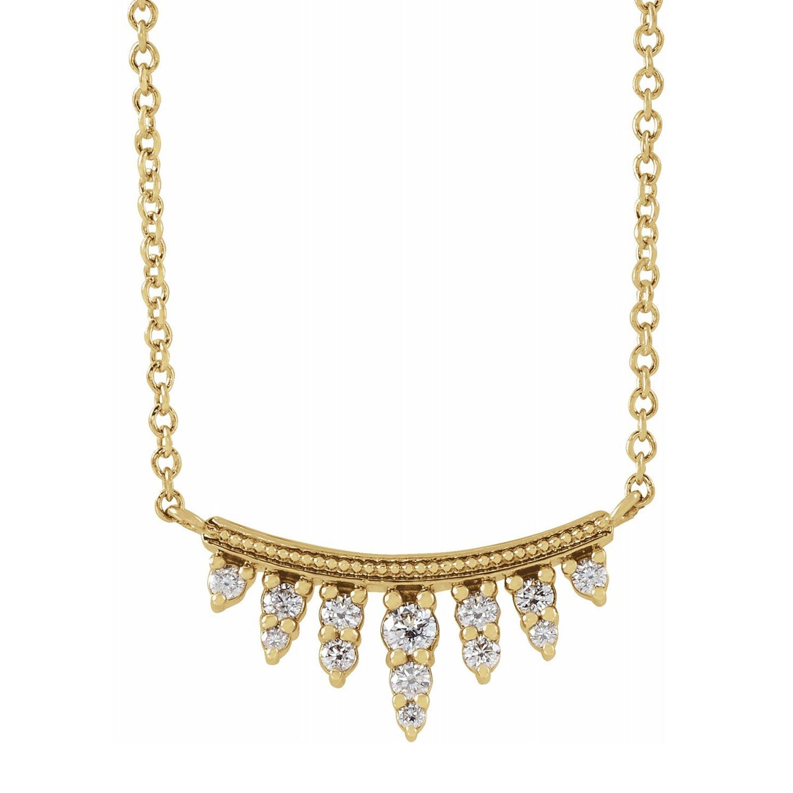14 Karat yellow gold diamond bar necklace on an 18 inch chain. Round brilliant diamonds total 1/6 carat. Available in Yellow Gold, Rose Gold, or White Gold.