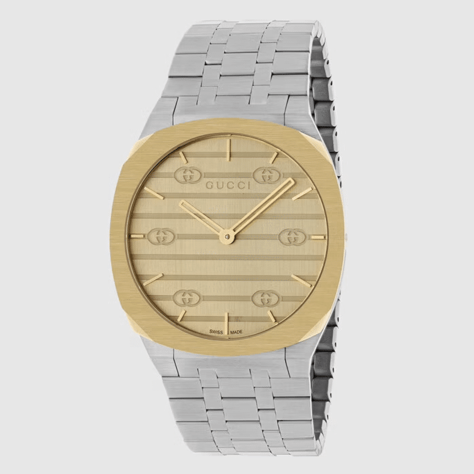 The GUCCI 25H’s streamlined silhouette was inspired by the sleek forms of contemporary architecture. The watch is presented with a gold-plated multi-layered case and five-link steel bracelet. The golden brass dial is completed with the Interlocking G motif. The name, GUCCI 25H, is attributed to a particularly symbolic talisman for Creative Director Alessandro Michele.