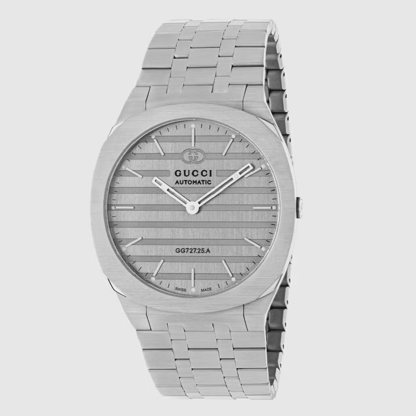 The GUCCI 25H’s streamlined silhouette was inspired by the sleek forms of contemporary architecture. The watch is presented with a thin multi-layer case and five-link steel bracelet while the design is completed by the ‘GG727.25.A’ engraving—a reference to important numerical symbols within Gucci. The name, GUCCI 25H, is attributed to a particularly symbolic talisman for Creative Director Alessandro Michele.
