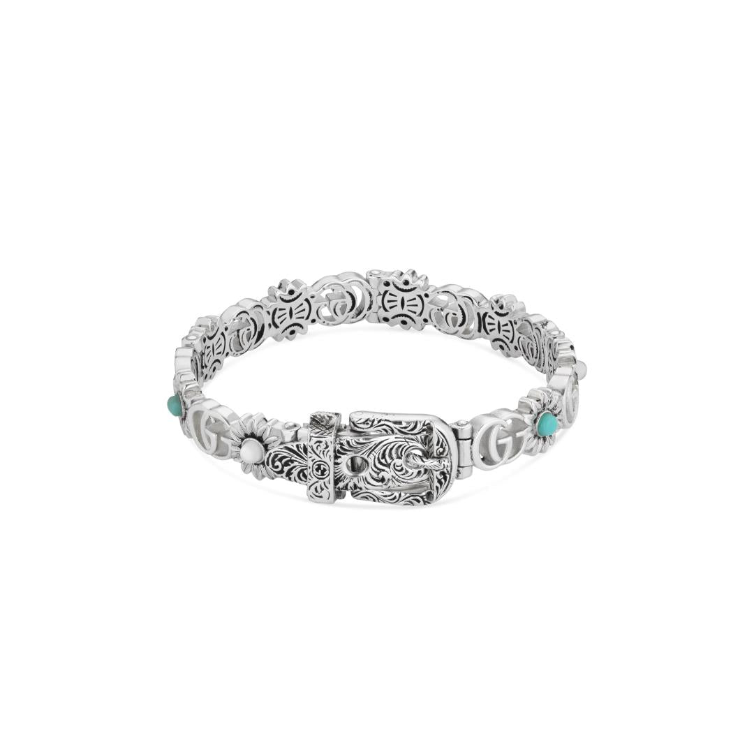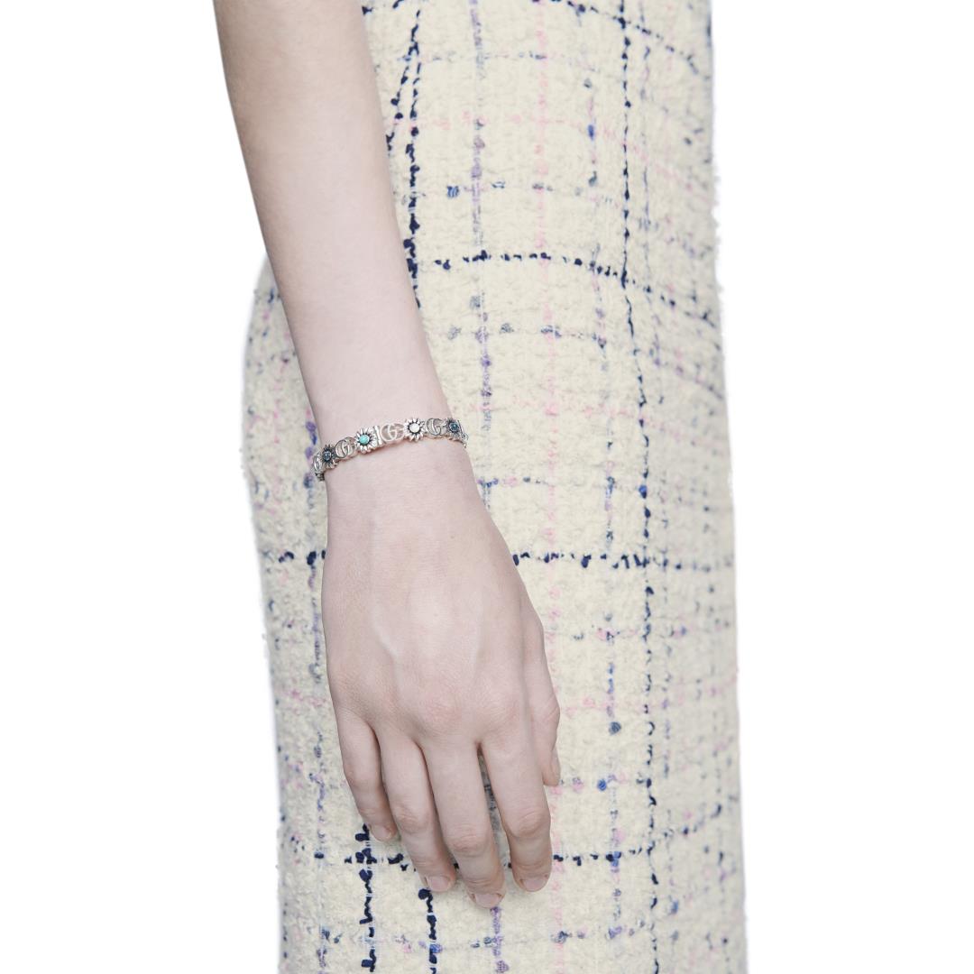 Bracelet with Interlocking G and flower motif in shiny aged sterling silver, mother of pearl, blue topaz and turquoise resin