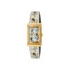 - Yellow gold PVD case, white mother of pearl dial, white leather strap with small flowers print
