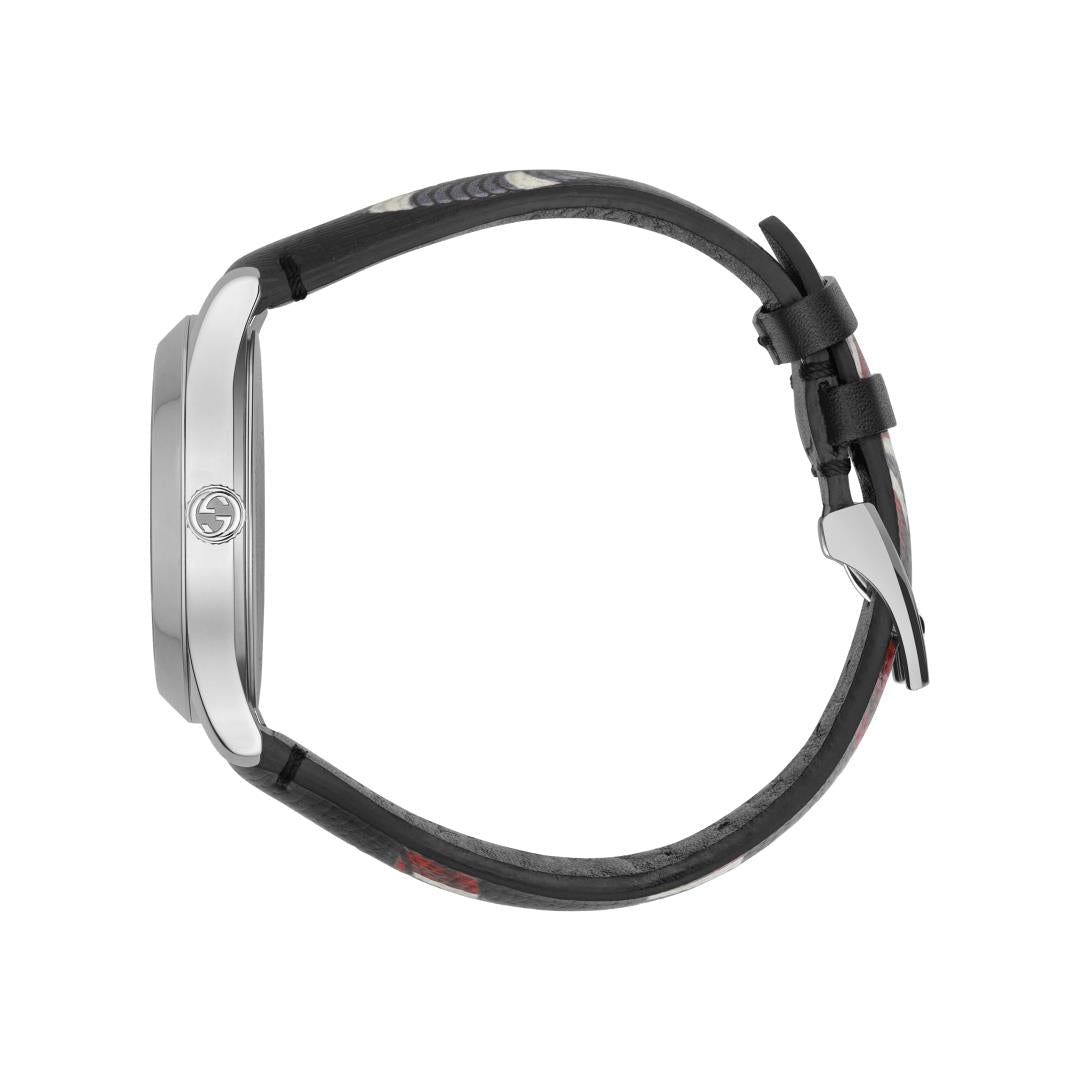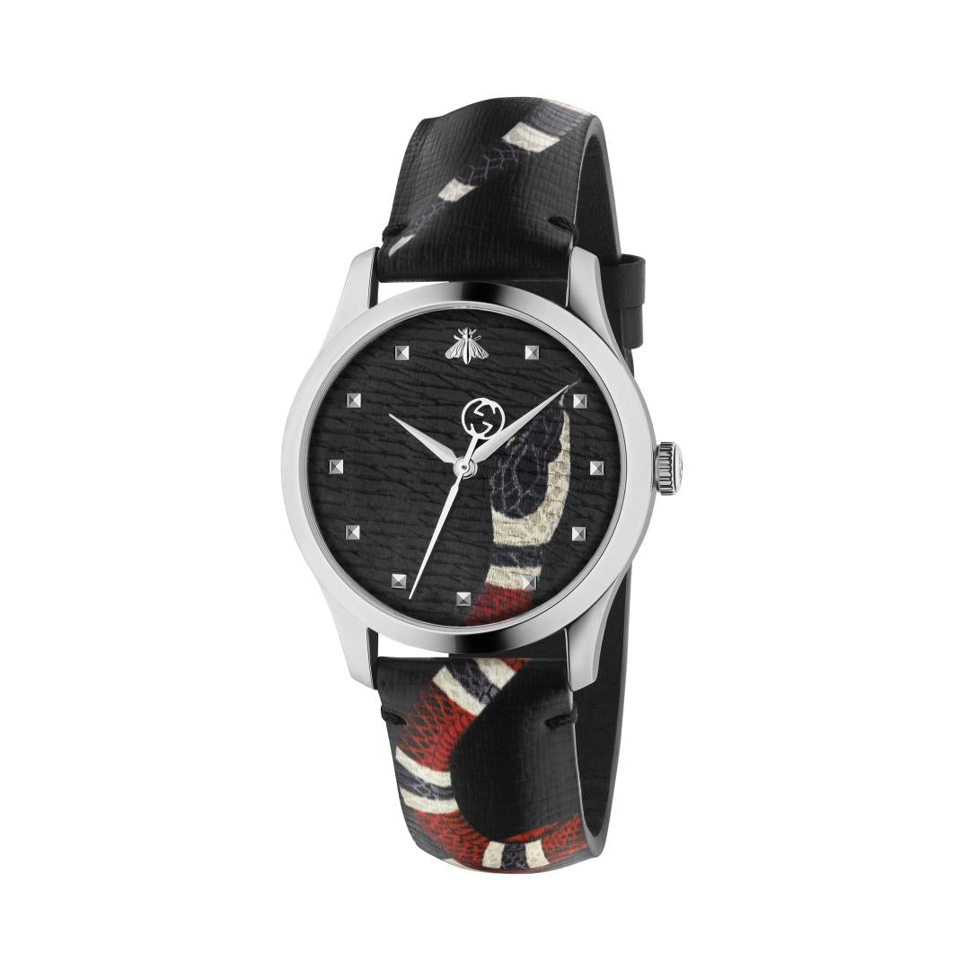 - Steel case, black leather dial with printed snake head, black leather strap with printed snake body