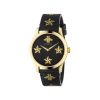 - Yellow gold PVD case, black leather dial with gold bee and stars details, black leather strap with gold bees and stars details