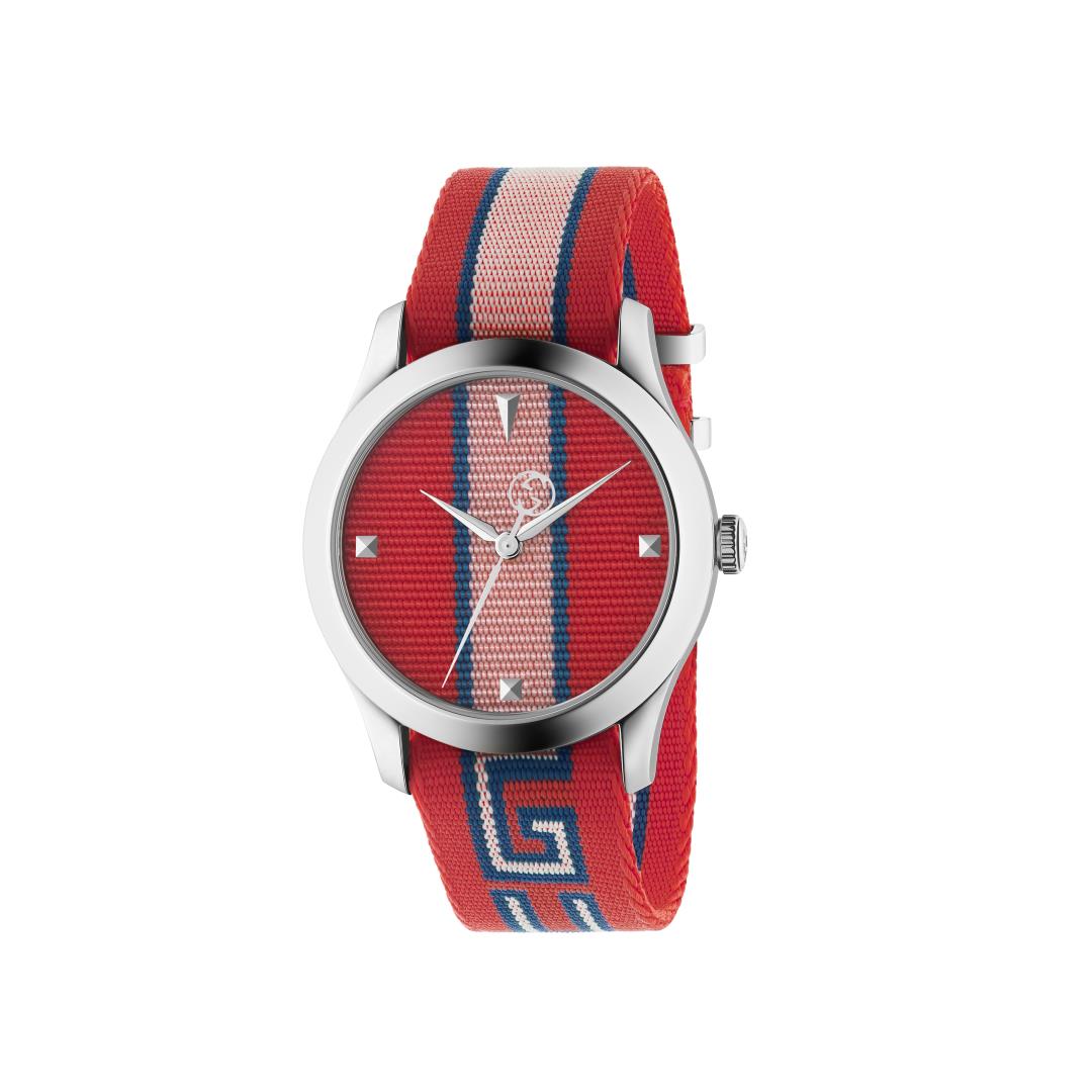 - Steel case, cherry red, light blue and pink nylon dial, cherry red, light blue and pink nylon strap with Gucci script