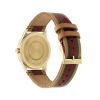 - Yellow gold PVD case, light brown leather dial and strap with green-red-green web