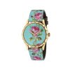 - Yellow gold PVD case and bezel with studs, aquamarine shanghai leather dial and strap with flowers printing