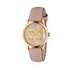 - Yellow gold PVD case, pastel pink mother of pearl dial with four feline heads, pastel pink leather strap