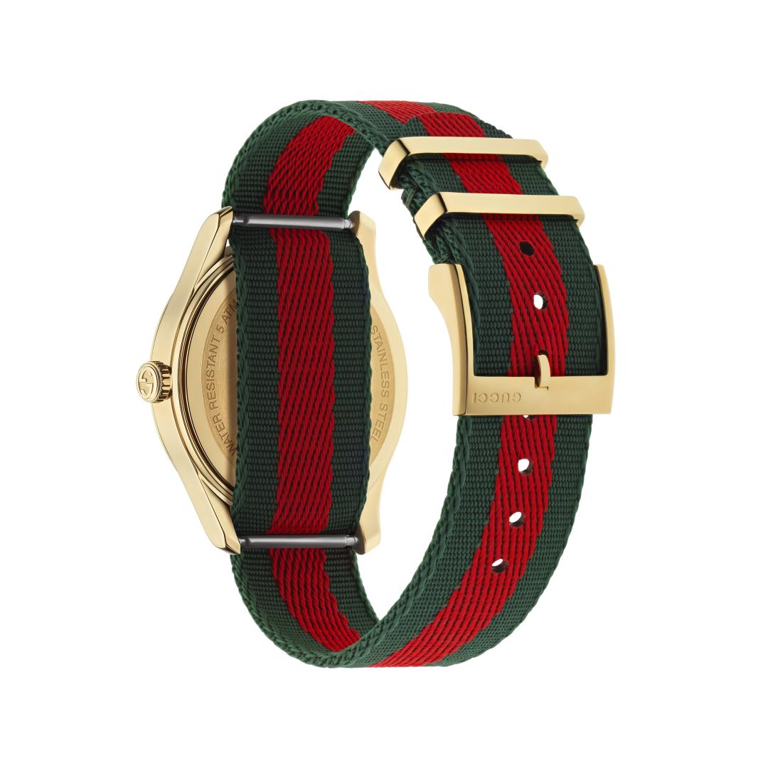 - Yellow gold PVD case, green-red-green web nylon dial with embroidered gold bee, green-red-green web nylon strap