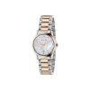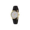 - Light yellow gold PVD case, silver diamond pattern dial, black leather strap