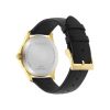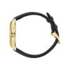 - Light yellow gold PVD case, silver diamond pattern dial, black leather strap