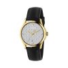 - Light yellow gold PVD case, silver diamond pattern dial, black leather strap