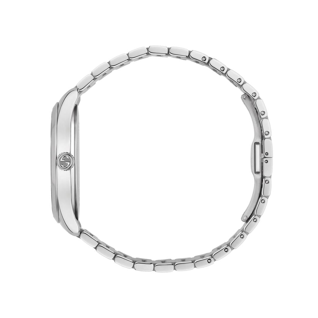 - Steel case, black sun-brushed dial with bee motif, steel bracelet