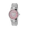 - Steel case and bracelet, pink mother of pearl dial with multi icon indexes and feline head