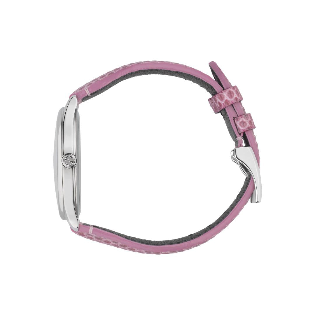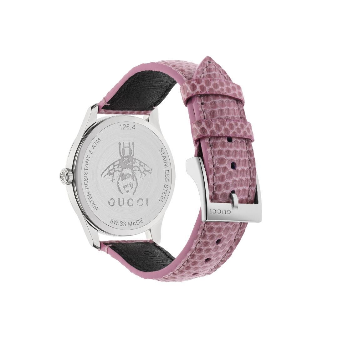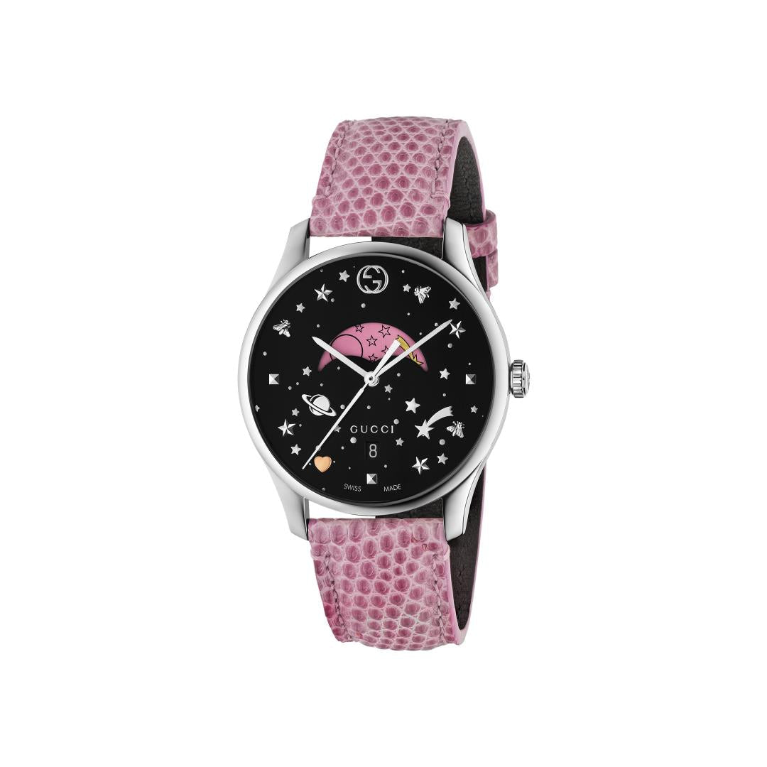 - Steel case, black dial with silver colored stars and planet motifs, pink lizard strap
