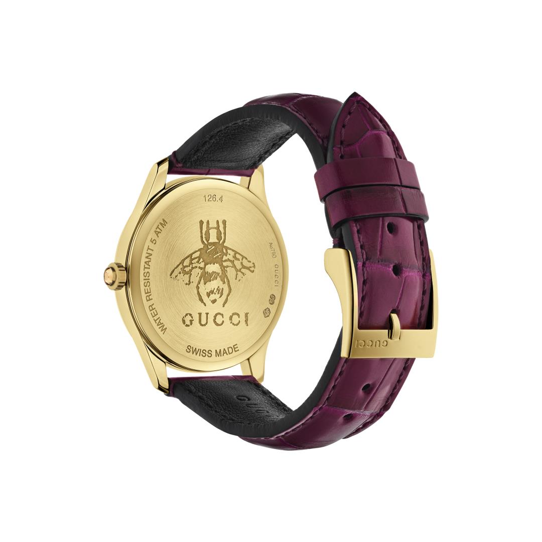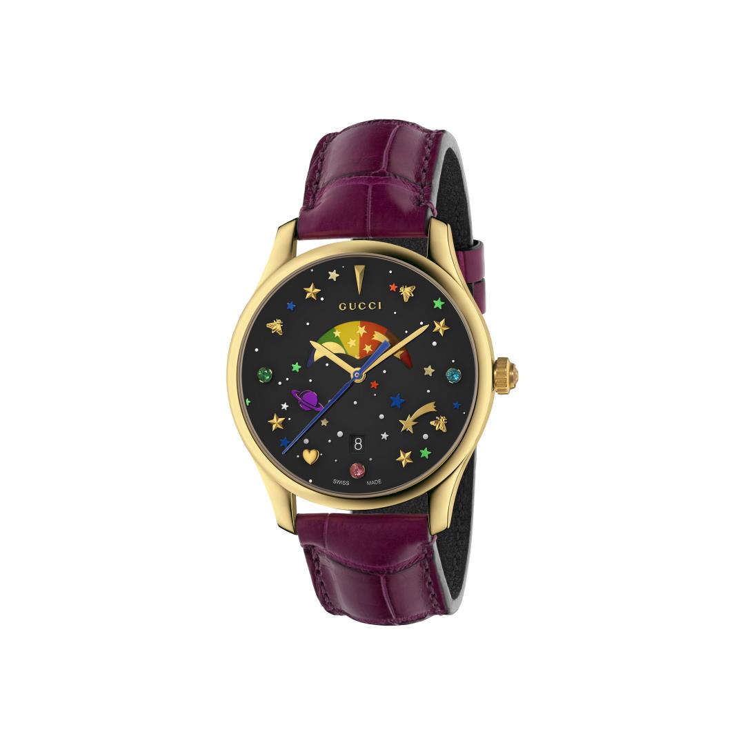 - 18kt yellow gold case, black dial with multi-colored stars and planet motifs, interchangeable purple alligator strap