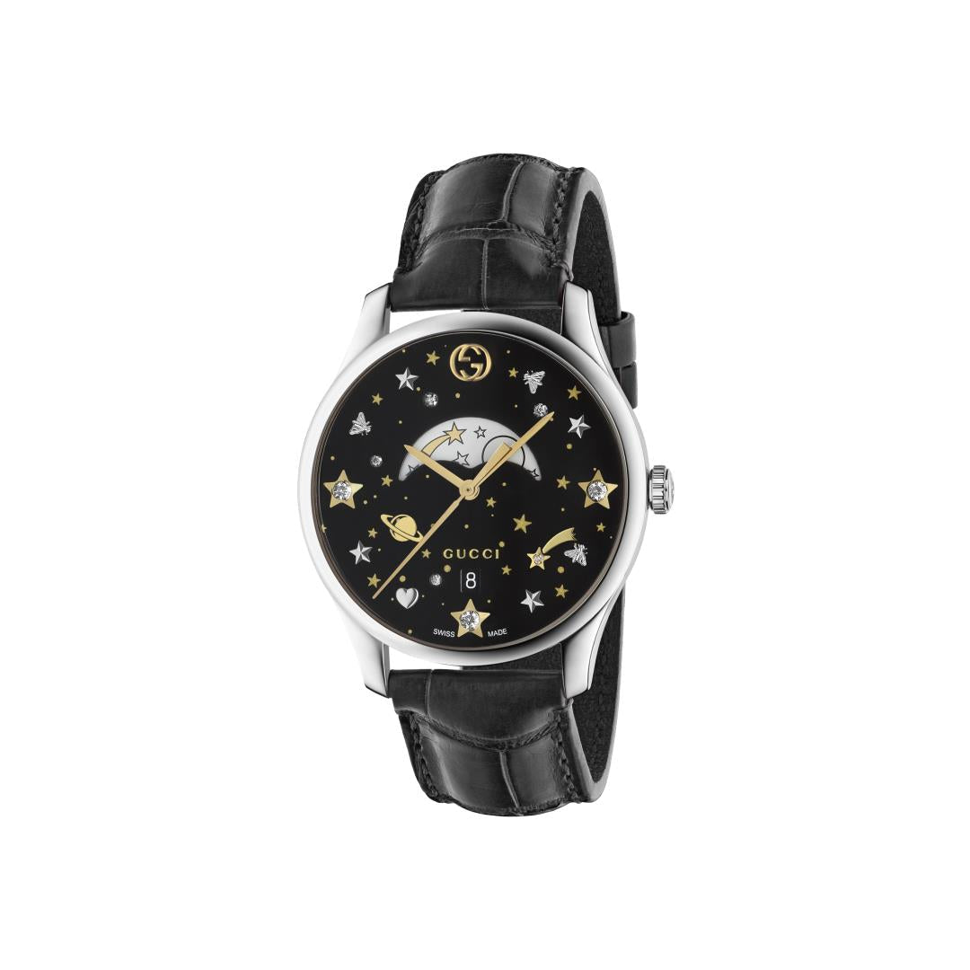 - Steel case, black lacquered dial with white moonphase and diamonds details, interchangeable black alligator strap