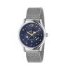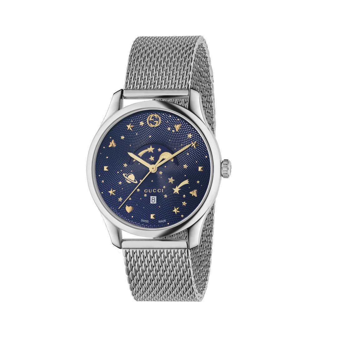 - Steel case, dark blue dial with yellow gold colored stars and planet motifs, steel mesh bracelet