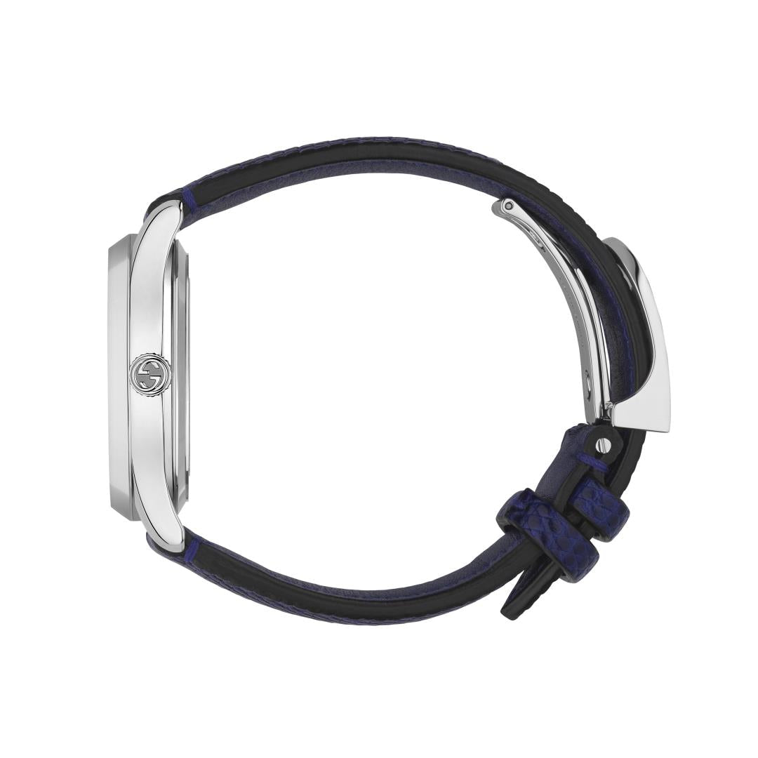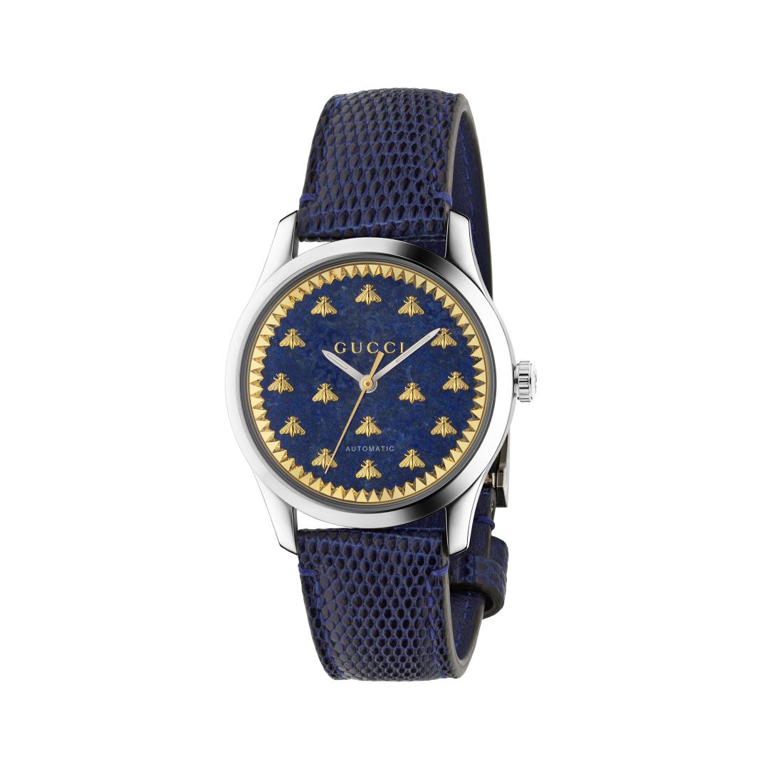 - Steel case, blue lapiz stone dial with bees, interchangeable blue lizard strap