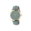 - Yellow gold PVD case, pastel sky blue Gucci Signature leather dial and strap