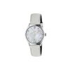 - Steel case, white mother of pearl dial, interchangeable white lizard strap