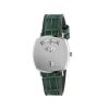 - Steel case, 3 windows indicating hour, minute & date, green alligator strap