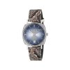 - Steel case, light blue and silver dial with Gucci logo, interchangeable ayers with printed pattern strap