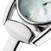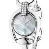- Steel case set with 12 diamonds, white mother of pearl dial, steel bangle