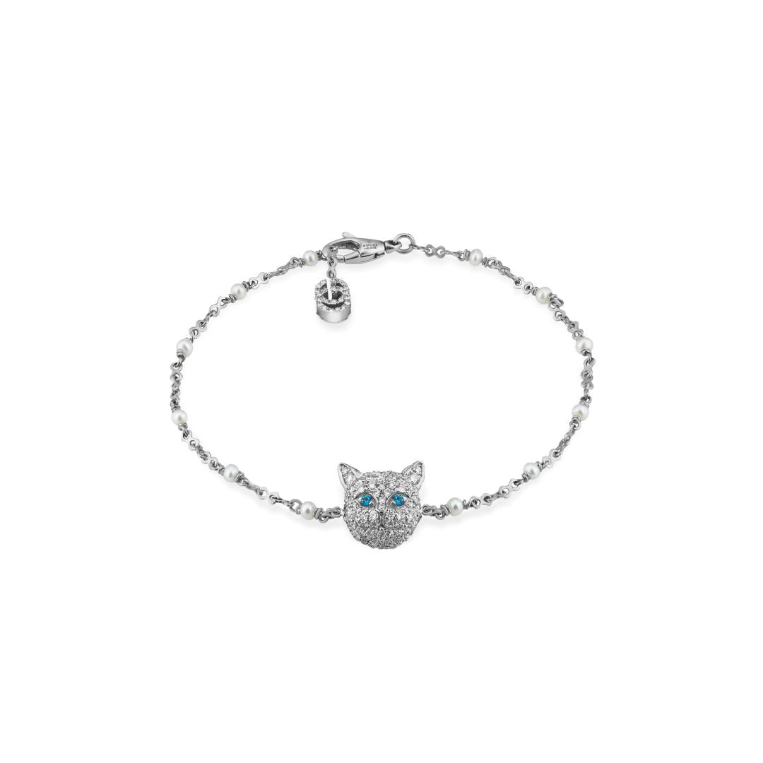- Bracelet with feline head motif in 18kt white gold, blue topaz e and diamonds, total 1.30 carats, brilliant cut, G/H, VVS