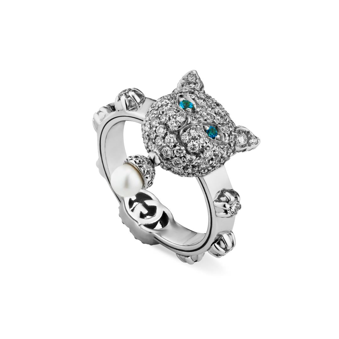 - Ring with feline head motif in 18kt white gold, blue topaz and diamonds, total 1.21 carats, brilliant cut, G/H, VVS