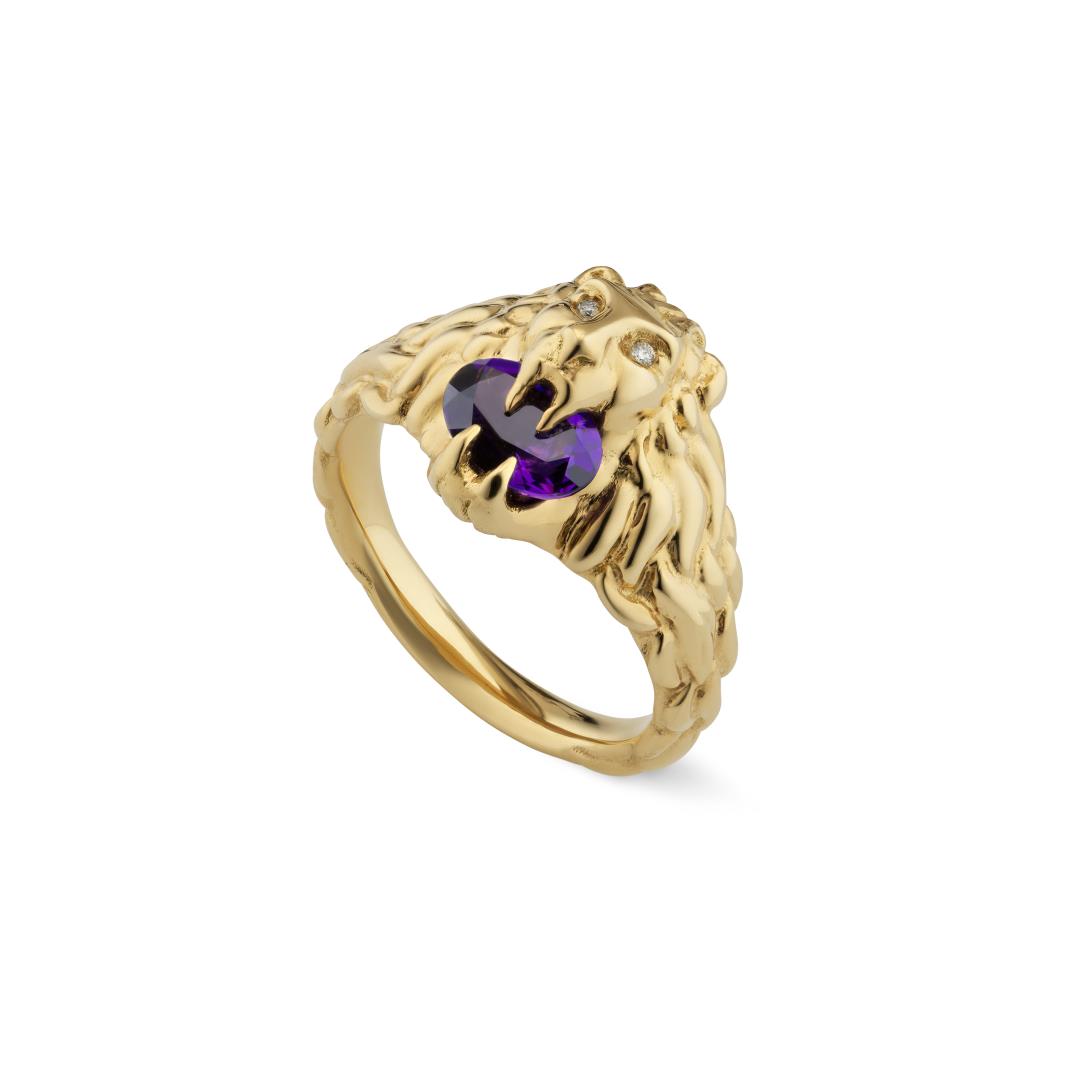 - Lionhead ring in yellow gold, amethyst and diamonds