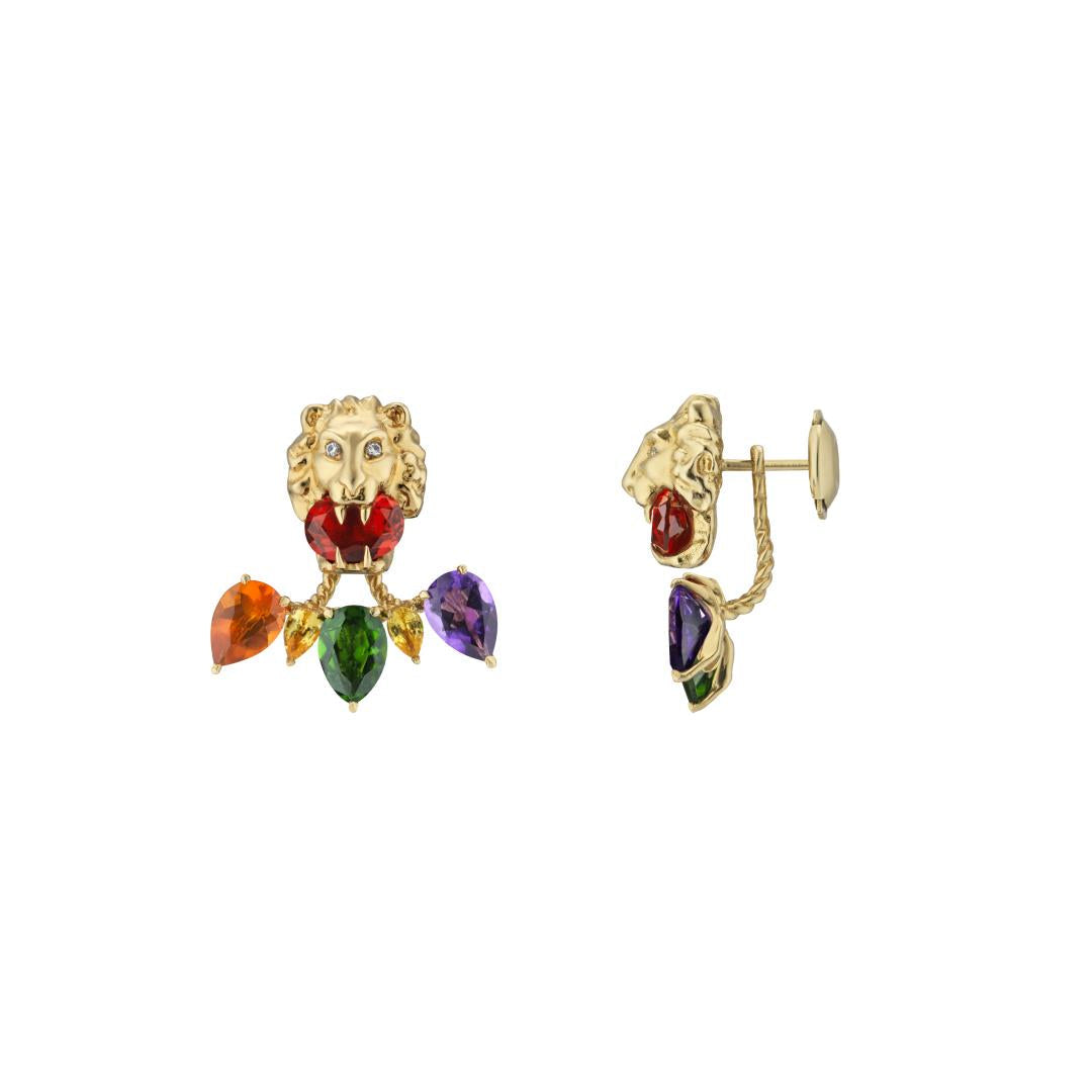 - Lionhead single earring in yellow gold with sapphire, fire opal, amethyst, chromodipside and diamonds