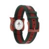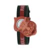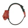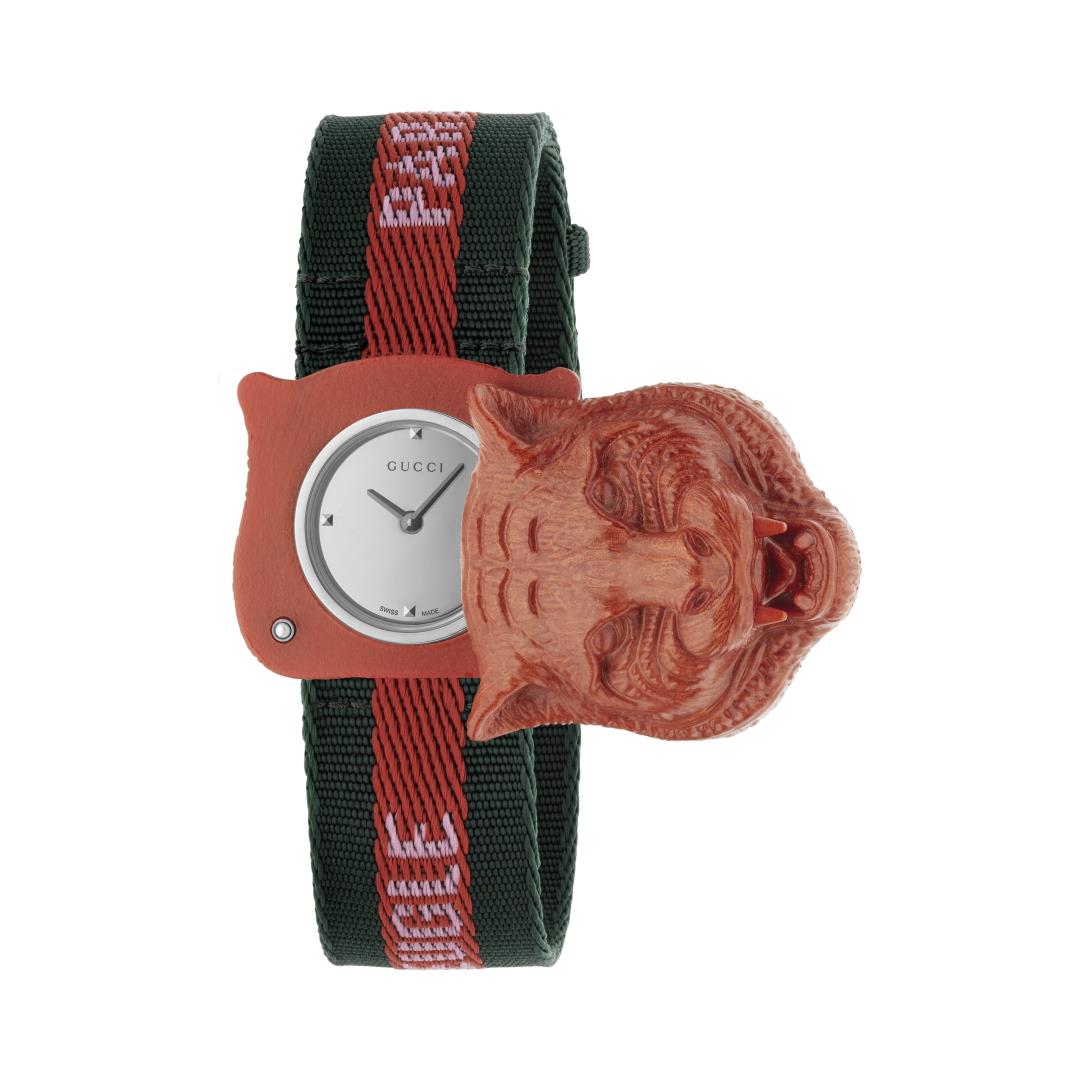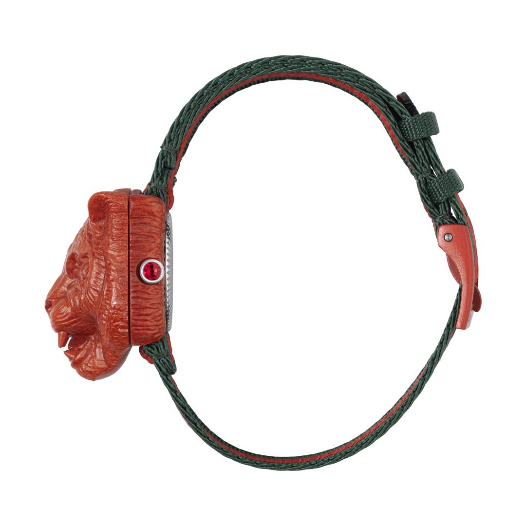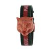 - Red resin rotating feline head case, silver mirror dial, green-red-green web nylon strap with «L’Aveugle par amour» phrase woven in the red stripe