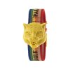 - Yellow resin rotating feline head case, silver mirror dial, rainbow strap with «L’Aveugle par amour» phrase woven in the centre