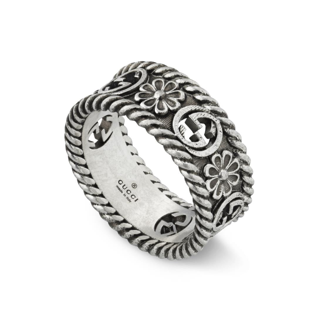 Ring with interlocking G and flower motif in aged sterling silver, width 8.5mm