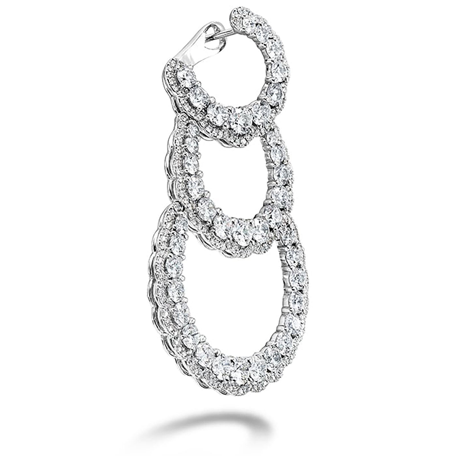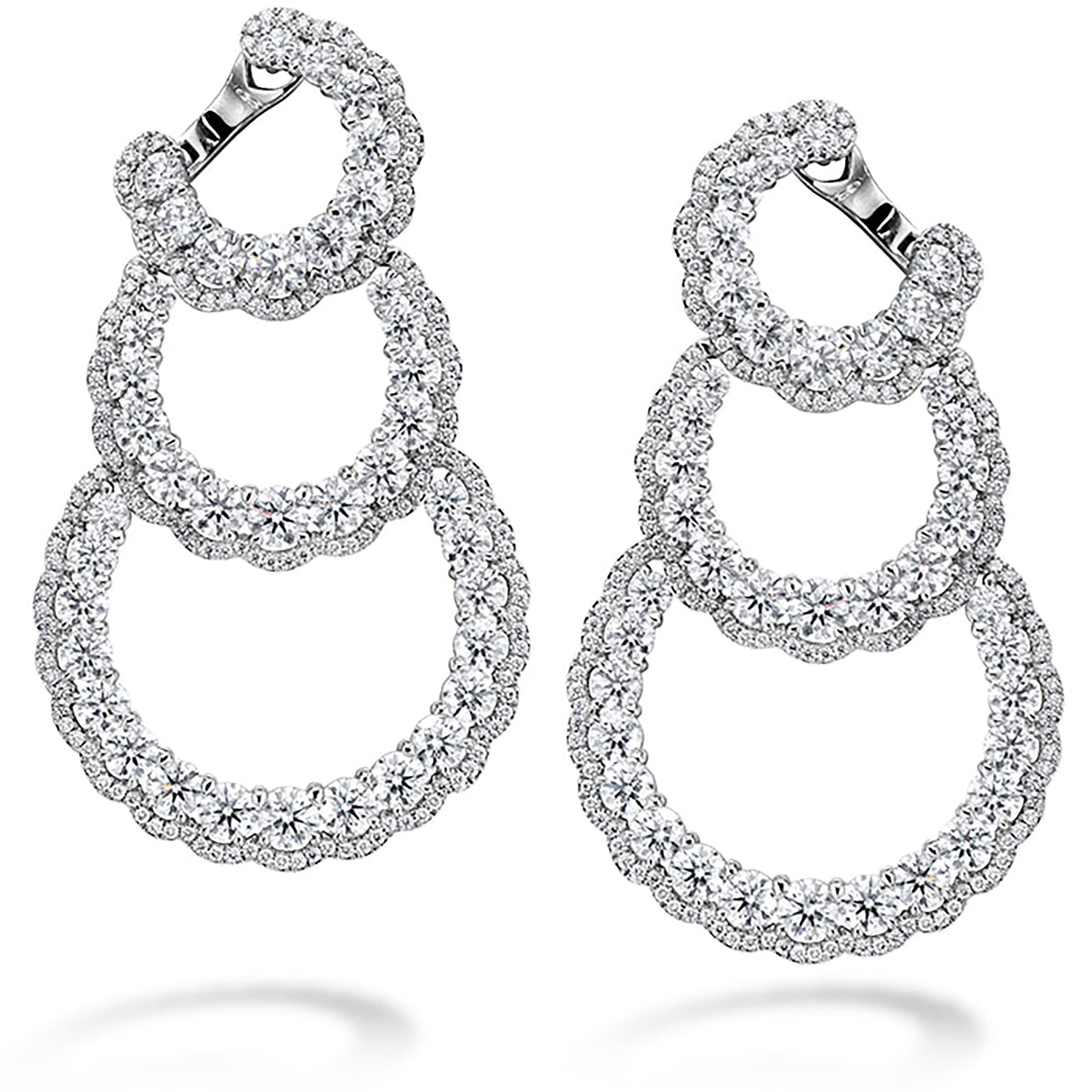 Diamonds in intricate diamond halos give the look of exquisite woven diamond embroidery. Three tiers of hoops are stacked one on top of the other for a show-stopping look, and connection points between the tiers allow the earrings to move freely and catch the light.