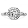 Old world style meets new world sparkle in this Art Deco-inspired design. A bezel-set center square-cut Dream diamond is surrounded by a halo of smaller diamonds and geometric detailing, making this architectural engagement ring a true standout.