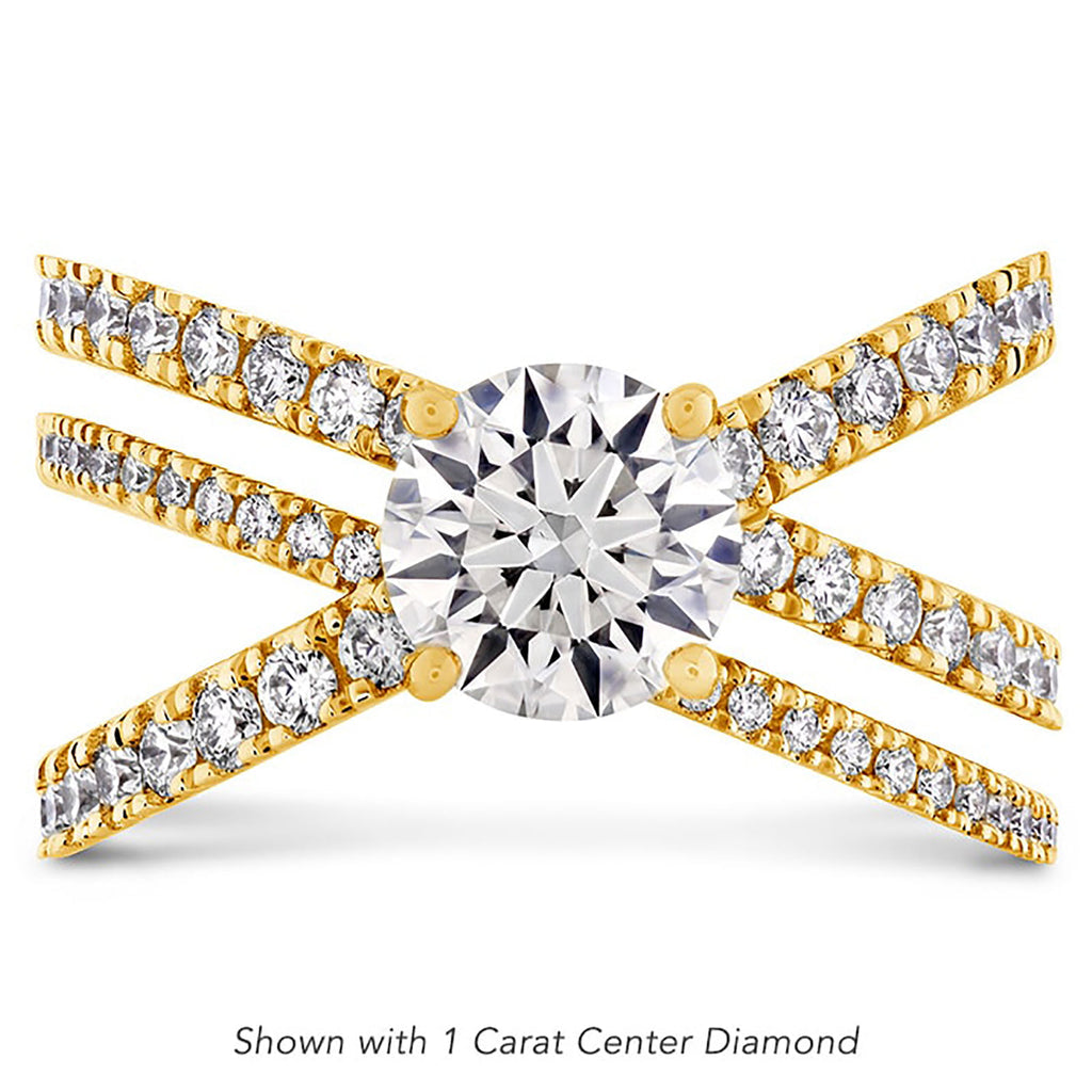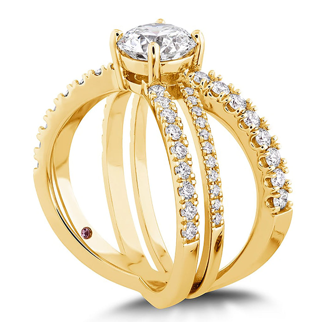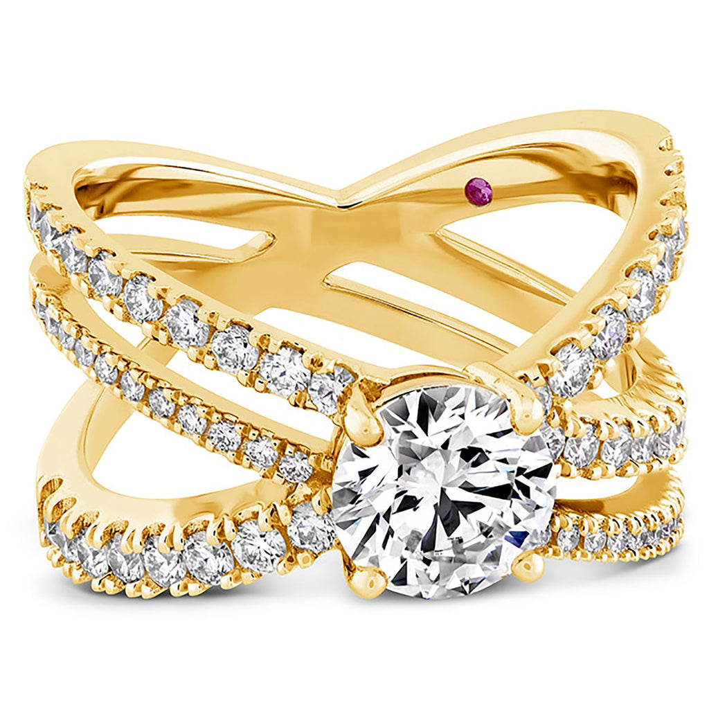 This ultra-explosive engagement ring features three rows of diamonds criss-crossing behind a round perfectly cut diamond. A ring that’s lightyears ahead of its time and bursting with brilliance, it was inspired by Hayley Paige’s Harley gown. Each Hayley Paige for Hearts On Fire design features a sapphire in Hayley’s favorite shade of pink on the inside of the band—an extra dash of sparkle just for you. As they were chosen by hand, these sapphires may vary slightly in shade from ring to ring.