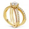 This ultra-explosive engagement ring features two rows of diamonds and one row of pink sapphires criss-crossing behind a round perfectly cut diamond. A ring that’s lightyears ahead of its time and bursting with brilliance, it was inspired by Hayley Paige’s Harley gown.