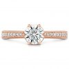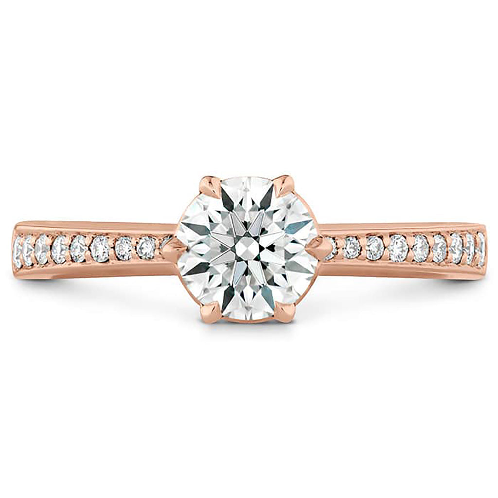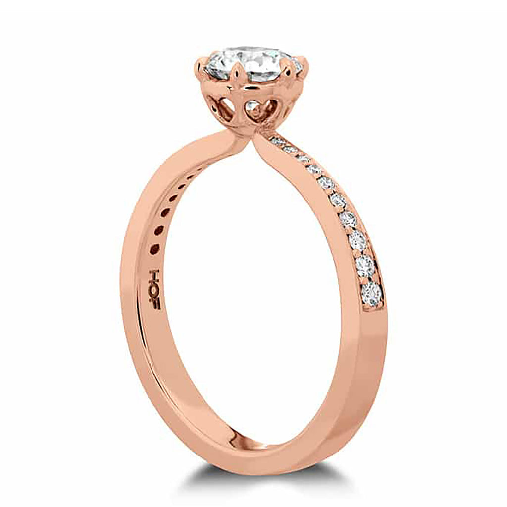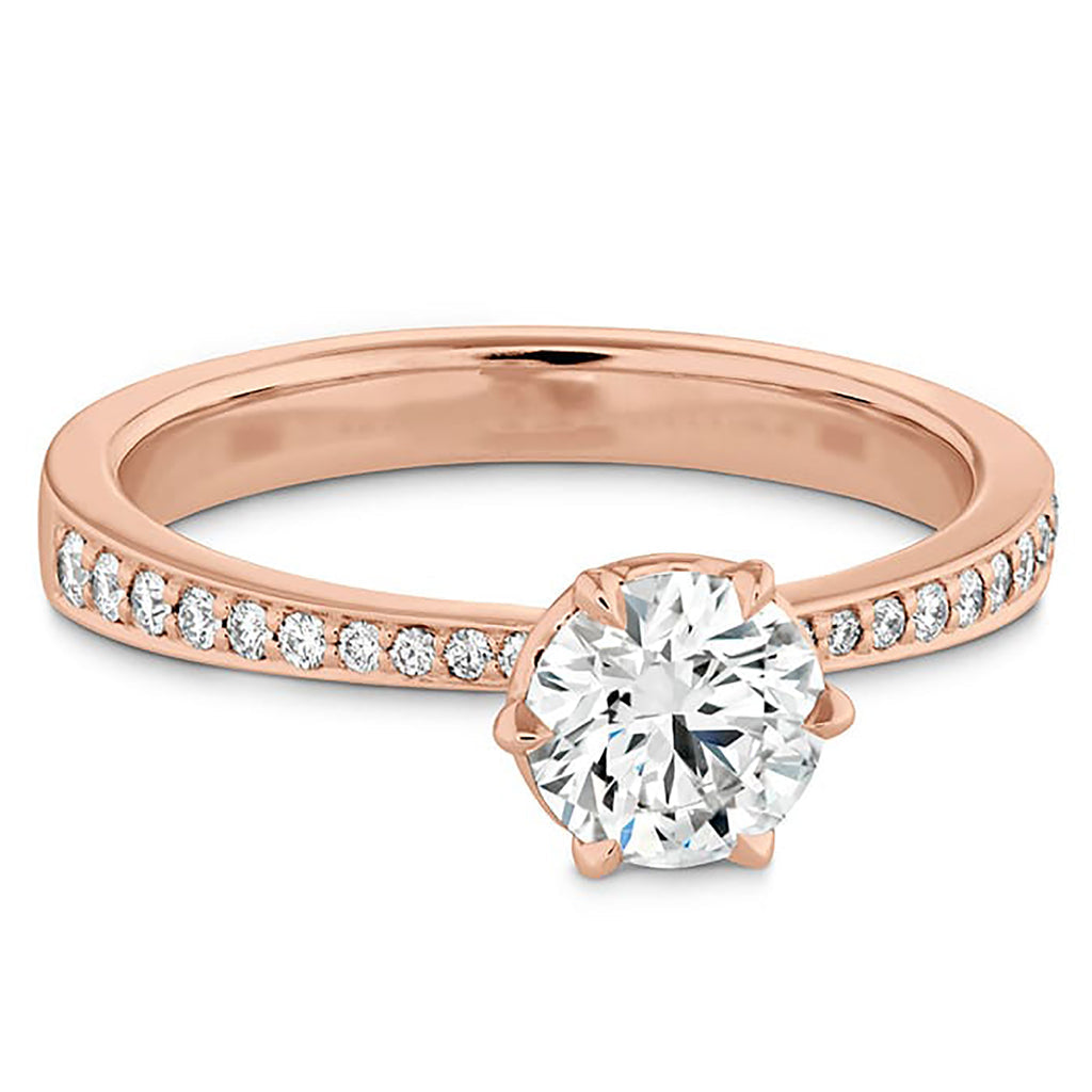 A perfectly cut center diamond is accentuated by six prongs and a band of channel-set accent diamonds. Heart motifs on the underside of the gallery let in additional light (and additional sparkle), while adding a sweet and sentimental element to your engagement ring.
