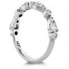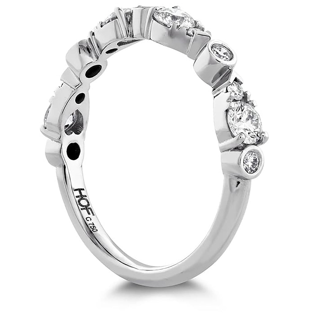 This beautiful band boasts several teardrop silhouettes created by pairs of perfectly cut diamonds, broken up by additional gems wrapped in delicate metal casings. A unique and striking look.