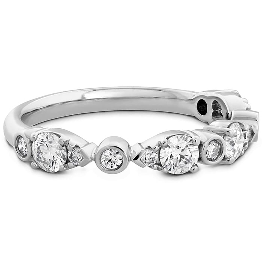 This beautiful band boasts several teardrop silhouettes created by pairs of perfectly cut diamonds, broken up by additional gems wrapped in delicate metal casings. A unique and striking look.
