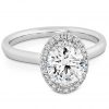 Our version of a fancy shaped diamond, this ring features our round brilliant diamond nestled in an oval-shaped halo. Accent diamonds in a tight pave setting are so precisely placed and undeniably brilliant that the result is the illusion of one large, oval-shaped diamond.