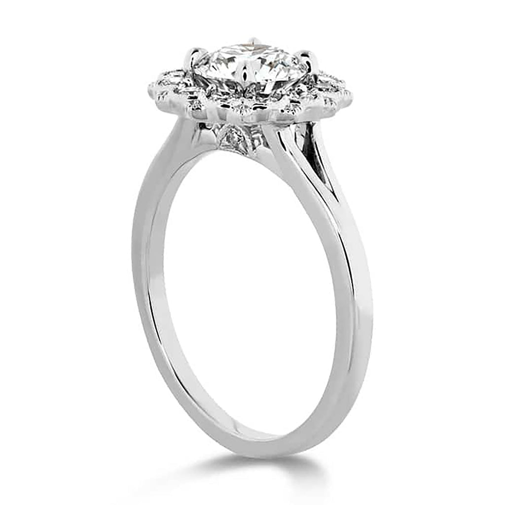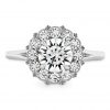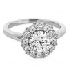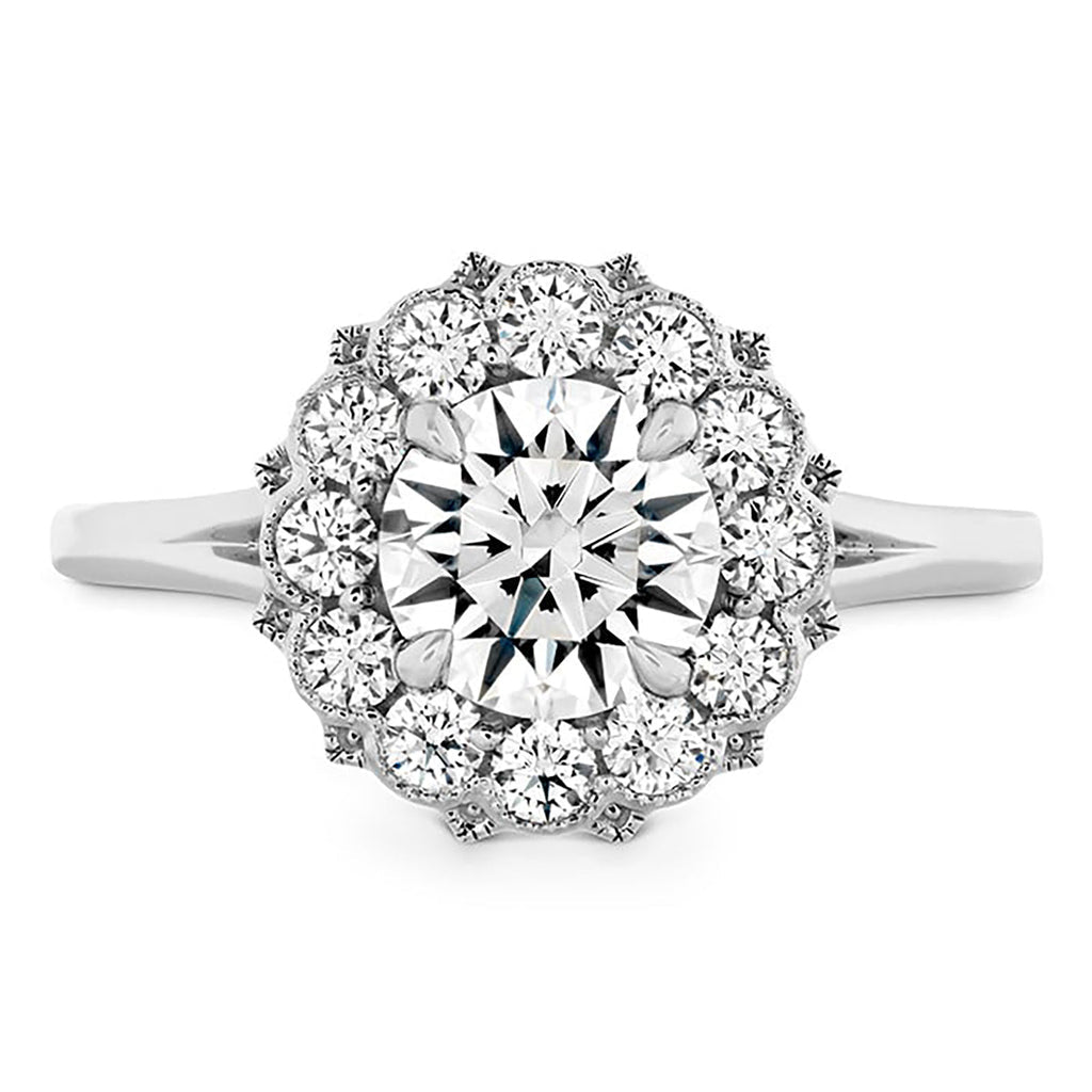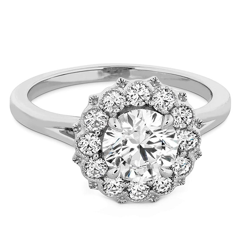 This beautiful, round center diamond is elegantly surrounded by a halo of smaller diamonds, creating a timeless style. With its vintage appeal and unique sparkle, this engagement ring is perfect for any woman.
