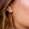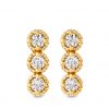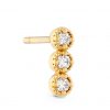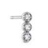 Three diamonds in a vertical line are each surrounded by four prongs and delicate Milgrain detail.