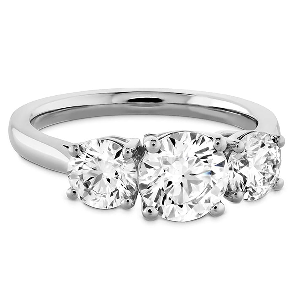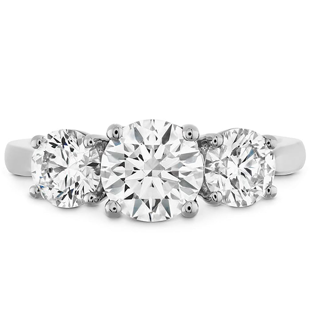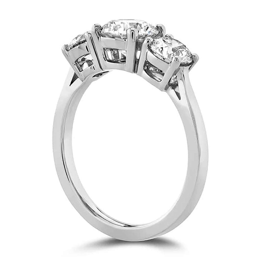 Three perfect round diamonds are perched side-by-side on this solid metal mounting. Pricing shown is for center diamond and mounting only. Pricing for accompanying side stones will vary.