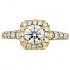 A perfectly cut center stone surrounded by a halo of smaller diamonds creates the illusion of an oversized cushion cut, while the tapered band glitters with even more diamonds.