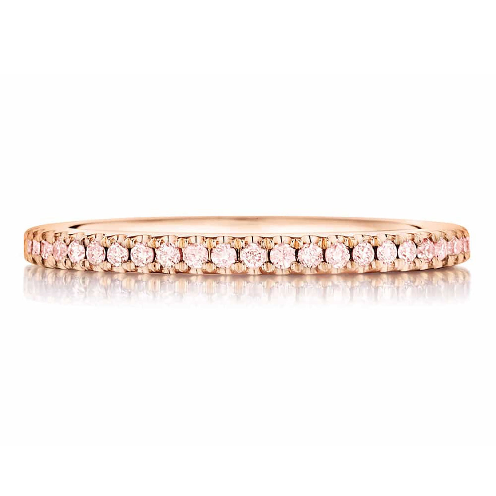Honor the love between you and your partner with this sleek wedding band for Ladies. This modern wedding band is made of precious metals crafted to last. The 14k rose gold shines brightly. Choose 14k rose gold and let its opulence represent your determined commitment to one another. Luminous fancy light pink diamond stones impart an opulent finish to the band. These are carved into round shapes with great care and is then kept in a secure prong setting in order to protect each stone. Commemorate the day you say “I do” with this gorgeous wedding band.
