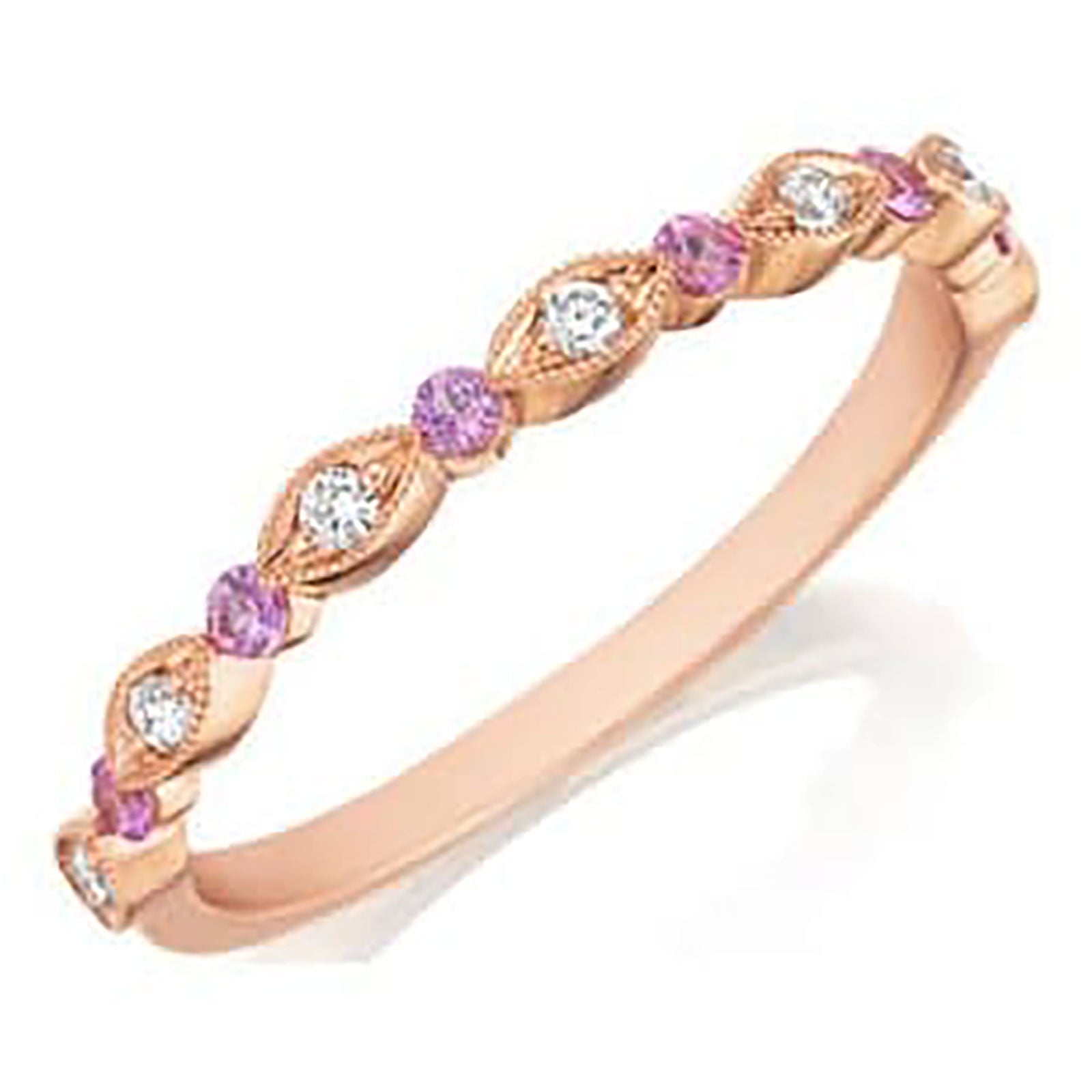 Express your commitment and love with this luxurious wedding band for Ladies. This vintage, milgrain wedding band is made of precious metals crafted to last. The 18k rose gold has been expertly polished to give it an immaculate sparkle. Choose 18k rose gold and let its elegant design represent your passionate commitment to each other. Shining sapphire, white diamond stones impart an opulent finish to the band. These are cut into round shapes with great detail and is then kept in a secure pave setting in a practical and fashionable way. Commemorate the day you exchange vows with this wedding band made to last through the ages.
