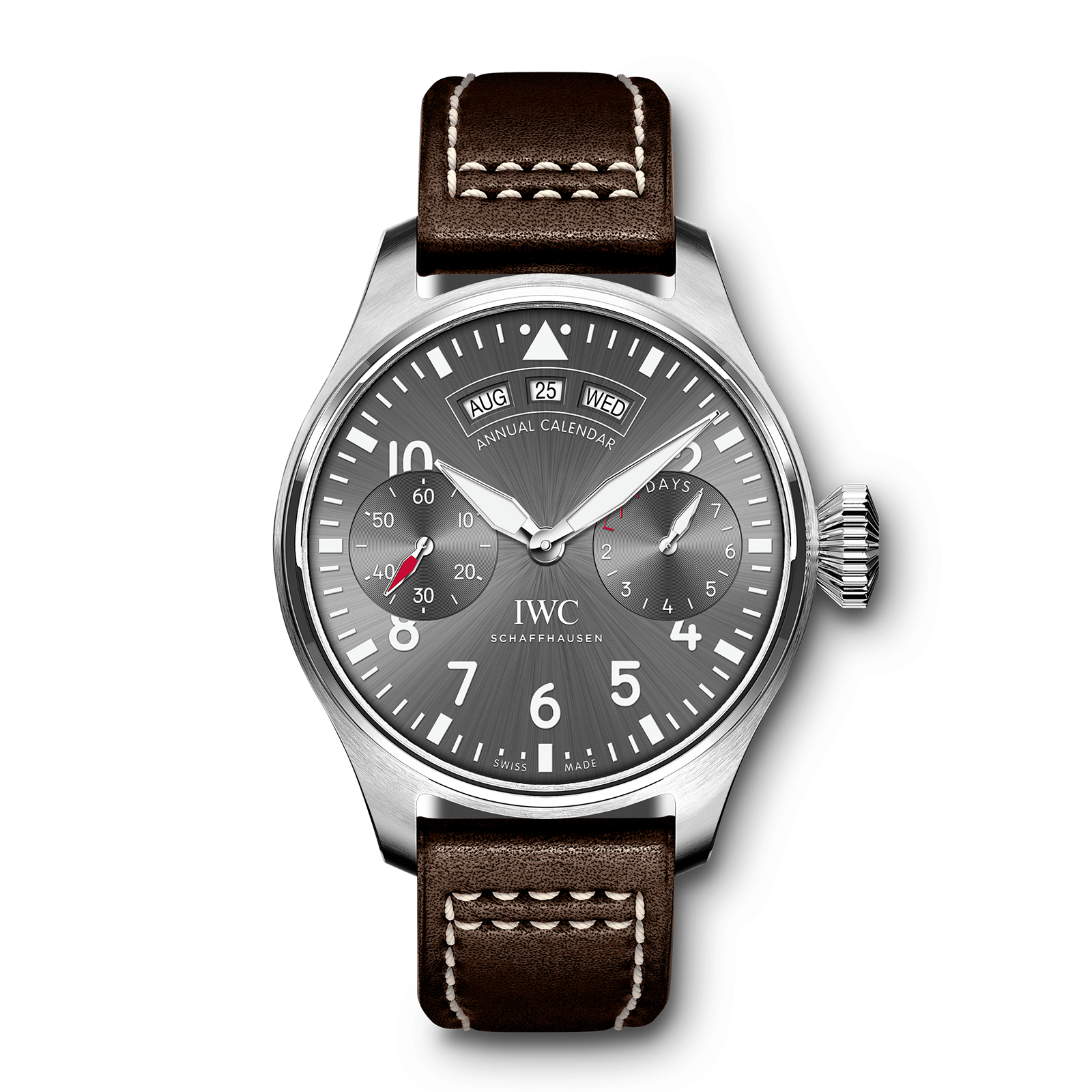 Stainless steel case, Automatic, self-winding, Diameter 46.2 mm, Slate-coloured dial with luminescence, Brown calfskin strap, Strap width 22.0 mm.