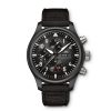 During tortuous manoeuvres involving supersonic jets like the F/A-18, pilots are subjected to high g forces. But also extended missions on aircraft carriers, where they are exposed to the humid, salt-bearing sea air, put an enormous strain on both personnel and material. The TOP GUN Chronograph was developed using robust and corrosion-resistant materials such as ceramic and titanium for the elite among the US Navy’s jet pilots. For the first time ever, IWC has equipped this classic with an in-house movement from the 69000-calibre family. Apart from its stopwatch function, the IWC-manufactured 69380 calibre also has displays for the day and date. The red small seconds hand at “6 o’clock” provides a striking colourful highlight on the black dial. The case is made of-non-reflective black zirconium oxide ceramic, the back of the case from titanium. The watch is attached to the wrist with a black textile strap.